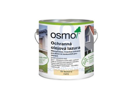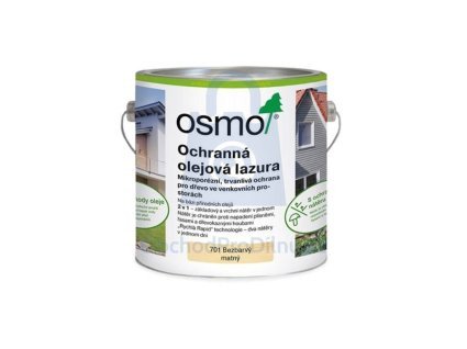 Ochranná olejová lazura 701 je bezbarvý matný nátěr určený pro svislé chráněné dřevěné konstrukce v exteriéru. Vytváří mikroporézní prodyšný povrch, který omezuje bobtnání a smršťování dřeva a zajišťuje odolnost vůči vodě a povětrnostním podmínkám. Slouží jako samostatný vrchní nátěr nebo jako matná bezbarvá finální vrstva přes barevné systémové nátěry Osmo. Nátěr obsahuje účinné složky pro ochranu povrchu před řasami a plísněmi. Neposkytuje však ochranu proti UV záření, a proto není vhodný na přímé slunce. Doporučuje se pro střešní podhledy, přístřešky a opláštění budov, kde je dřevo vystaveno pouze nepřímým povětrnostním vlivům. Vydatnost je cca 26 m²/l při jednom nátěru.