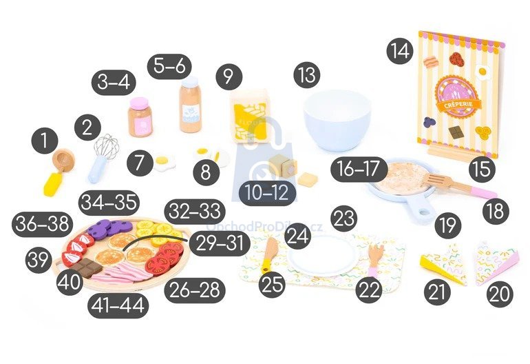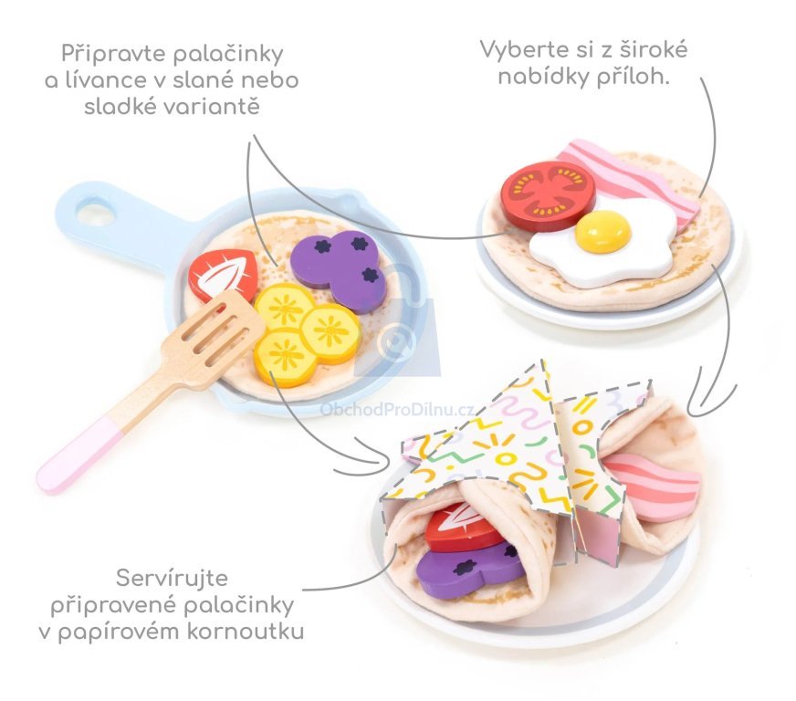 - Složení sady: nástroje (metla, naběračky, pánvička), suroviny (mléko, mouka, máslo), palačinky, lívance, ovoce, čokoláda, kornoutky, talířek, příbor, menu s receptem, prostírání aj.