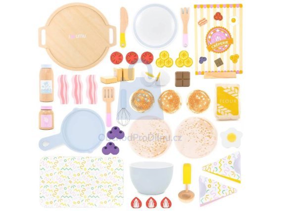 Palačinková sada UMU Toys je určena pro dětskou hru v kuchyni a obsahuje 44 dílů pro přípravu, zdobení a servírování palačinek a lívanců. Součástí jsou suroviny, nástroje, nádobí, menu s receptem i různé doplňky pro tvorbu sladkých či slaných variant. Děti si mohou osvojit základní úkony spojené s přípravou palačinek – od míchání těsta přes otáčení na pánvičce až po servírování na talíř nebo do papírového kornoutku. Tato sada podporuje kreativitu, motorické dovednosti a hru na „palačinkárnu“ či restauraci.