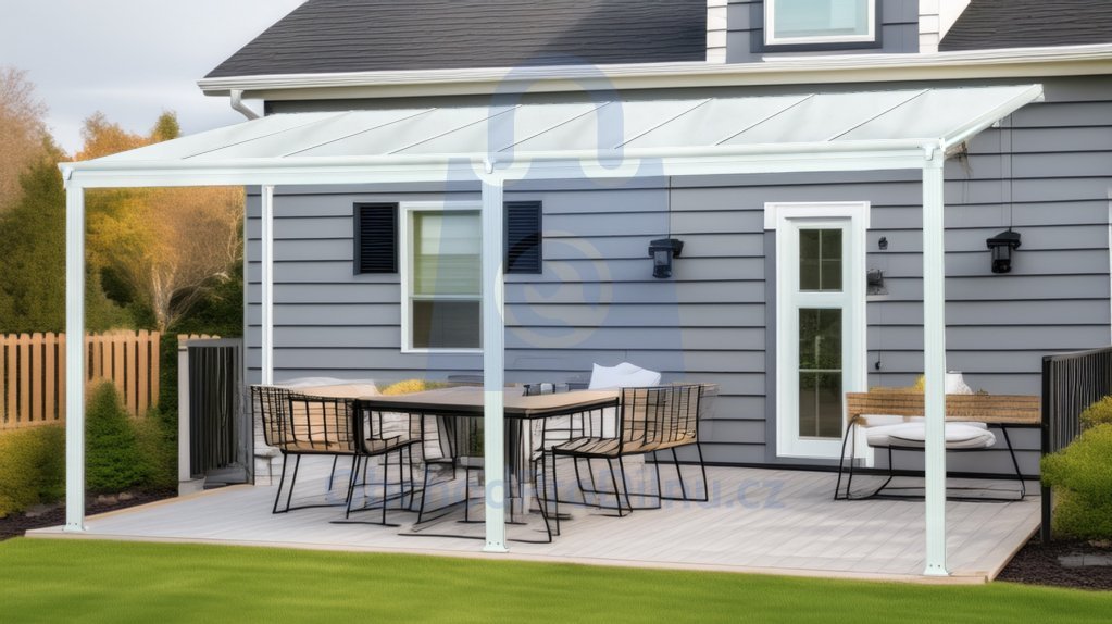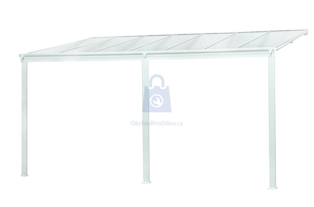 Hliníková pergola ke zdi, LANITPLAST, vám poskytne místo pro odpočinek přímo u vašeho domu. Konstrukce pergoly je tvořena z vysoce odolné hliníkové slitiny stříkané bílou či antracitovou práškovou vypalovanou barvou (komaxit). Tato barva je trvale odolná vůči přírodním vlivům. Střecha je vyrobena z plného, 6 mm silného polykarbonátu MARLON. Díky tomu, že v polykarbonátu nejsou žádné dutinky, jde o velmi pevný a odolný materiál, který odolává nárazům i krupobití, ale současně je průhledný, takže se podobá sklu. Polykarbonát je dodáván buď v čiré, nebo kouřově hnědé barvě.