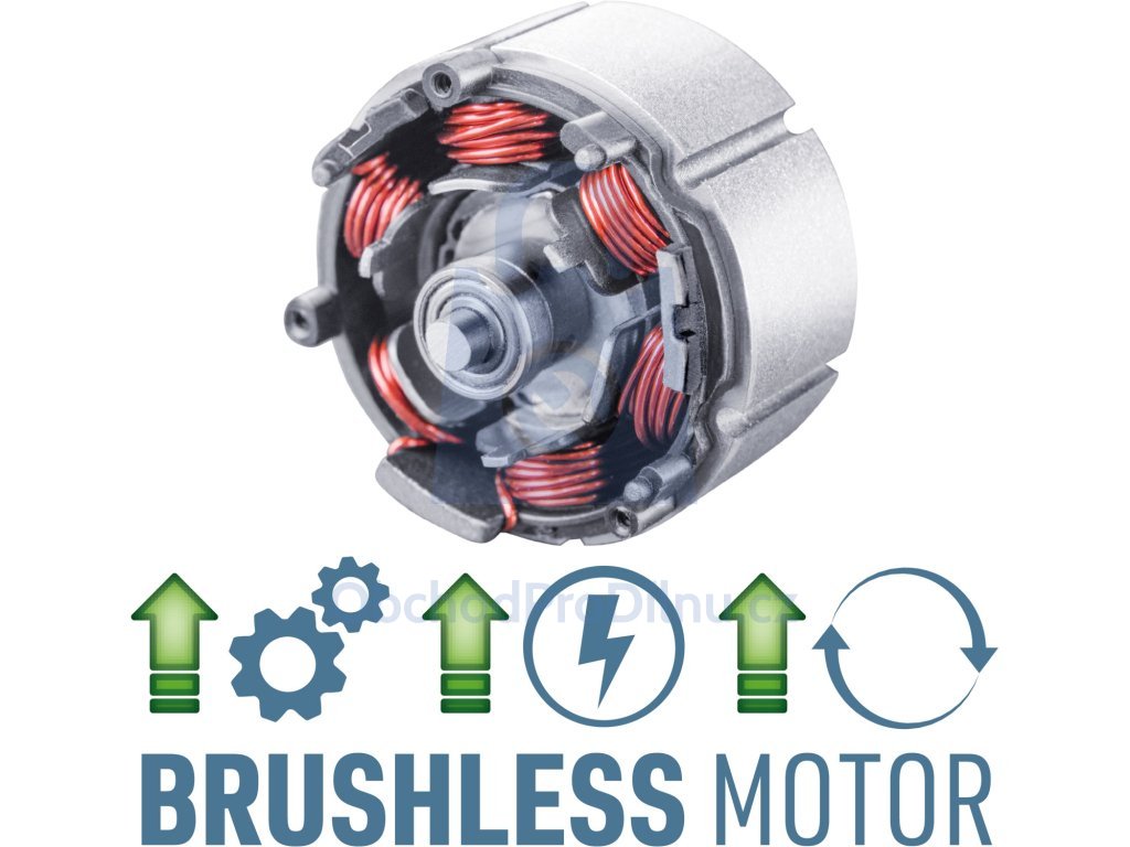 Srdcem pily je vysoce výkonný nejmodernější „brushless" motor, který má vyšší životnost, je výkonnější a má menší spotřebu elektrické energie než klasické motory s uhlíkovými kartáči.