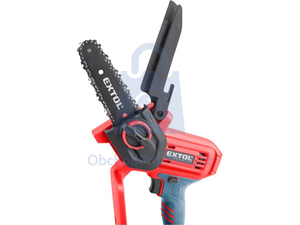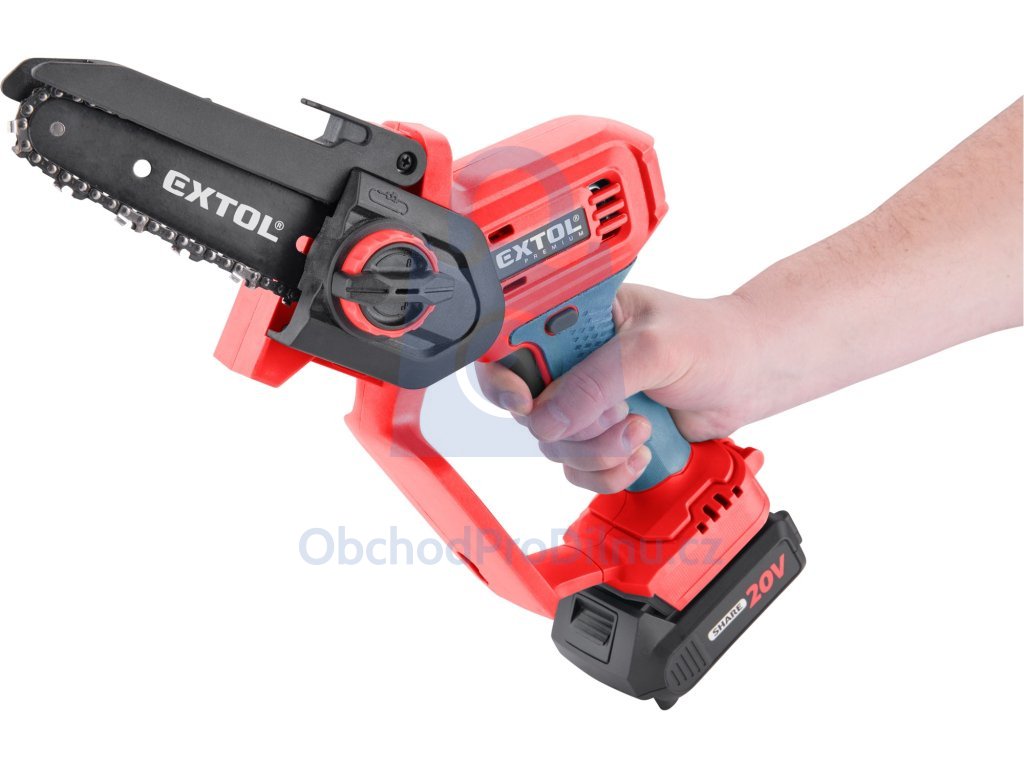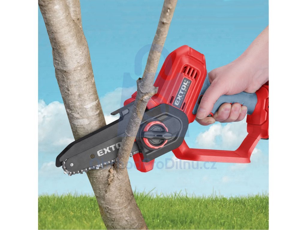 Jednoruční řetězová aku pila od zančky EXTOL PREMIUM je vhodná k prořezávání stromů a keřů nebo pro menší zkracovací řezy dřeva na zahradě, v dílně apod. Hmotnost aku pily je pouhých 1,8 kg. Navzdory nízké hmotnosti je její konstrukce dostatečně robustní na to, aby si poradila s větvemi. Pila je vybavena kvalitní vodící lištou a pilovým řetězem a má systém pro snadnou a rychlou výměnu řetězu a mechanismem pro jednoduché vypnutí řetězu. Bezpečnost při právi zvyšují: horní chránič řetězu, chránič rukou, pogumovaná rukojeť a spínač s pojistkou zabraňující náhodnému spuštění. Pogumovaná rukojeť je příjemná na držení, zabraňuje vysmeknutí pily z ruky a také tlumí vibrace. V porovnání s klasickými benzínovými pilami vydává aku pila menší hluk.