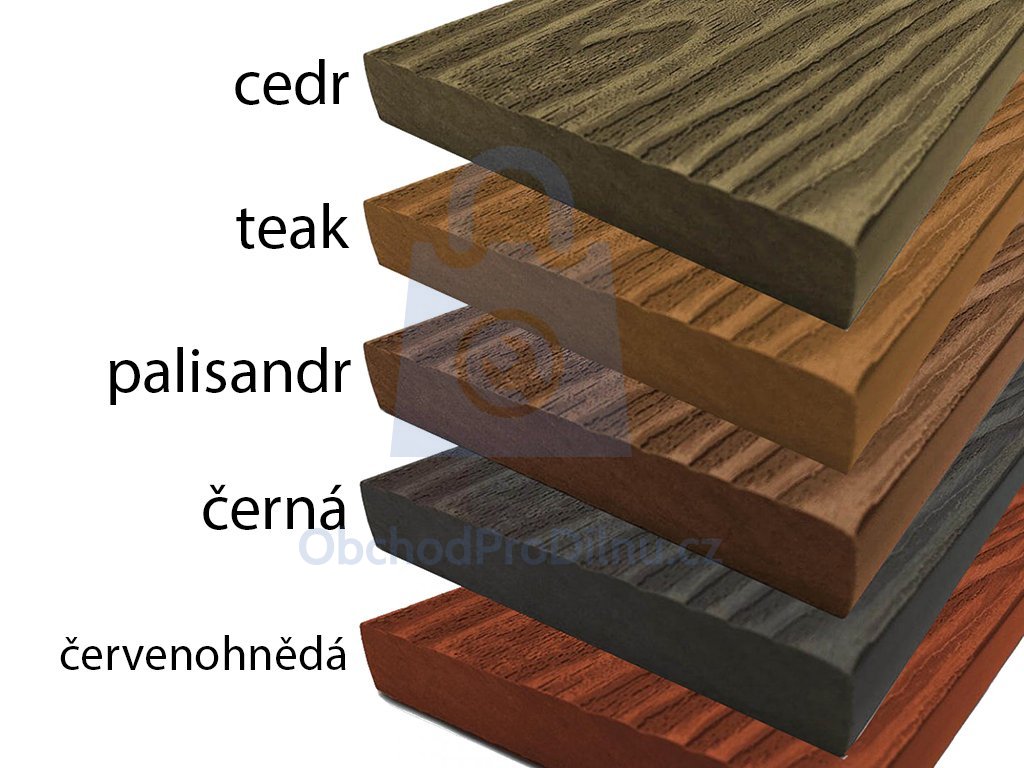 V nabídce naleznete plotovky o šířce 85 mm v různých délkách od 1 do 3 metrů v 5 různých barvách - cedr, palisandr, teak, červenohnědá a černá.