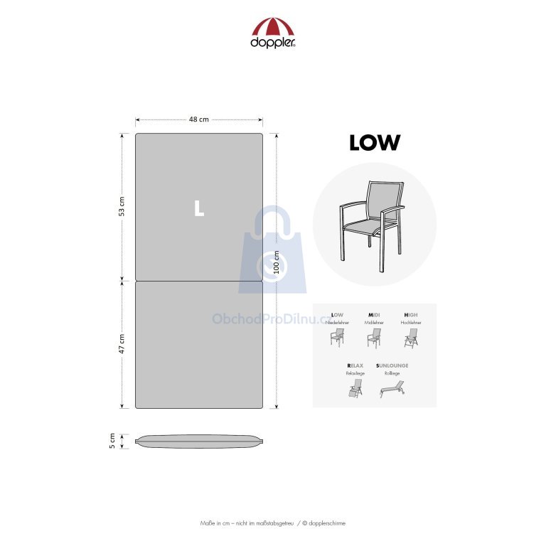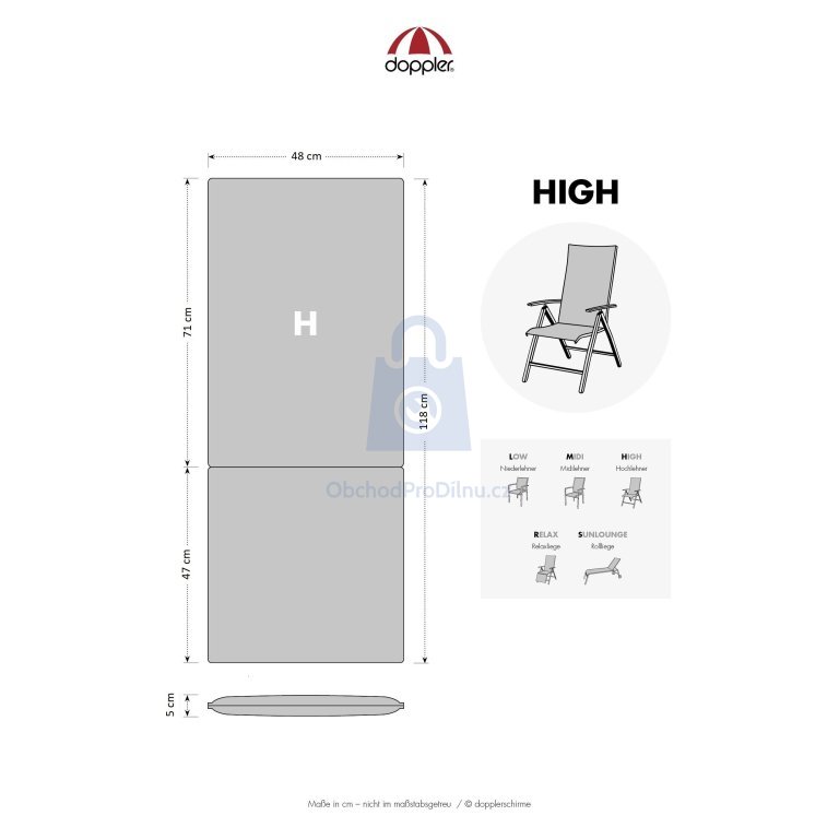Polstry na zahradní křesla a židle SPOT prodáváme ve 2 délkových variantách - vysoký s celkovou délkou 118 cm a nízký s celkovou délkou 100 cm.