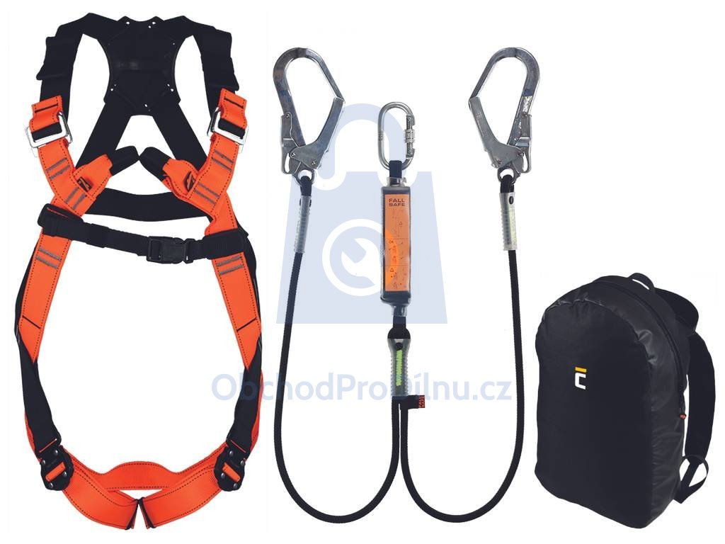 - Obsah sady: Zachycovací postroj, tlumič pádu se 2 lany ("Y"), 2x lešenářská karabina (50 mm), batoh (20 l)