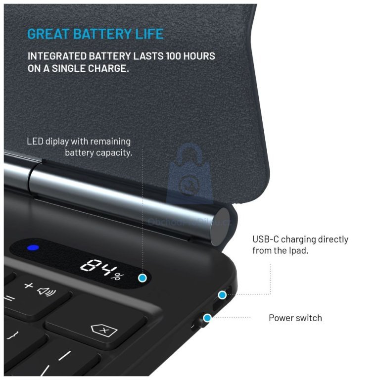 • Výdrž až 100 hodin na jedno nabití – USB-C nabíjení přímo z tabletu.