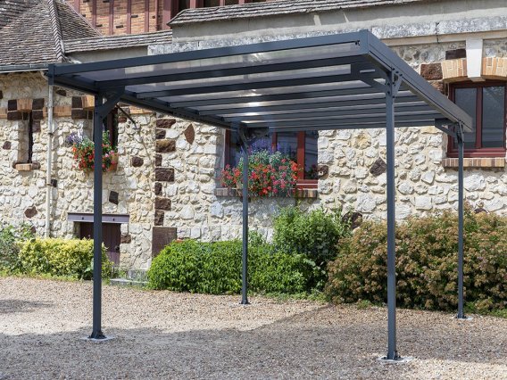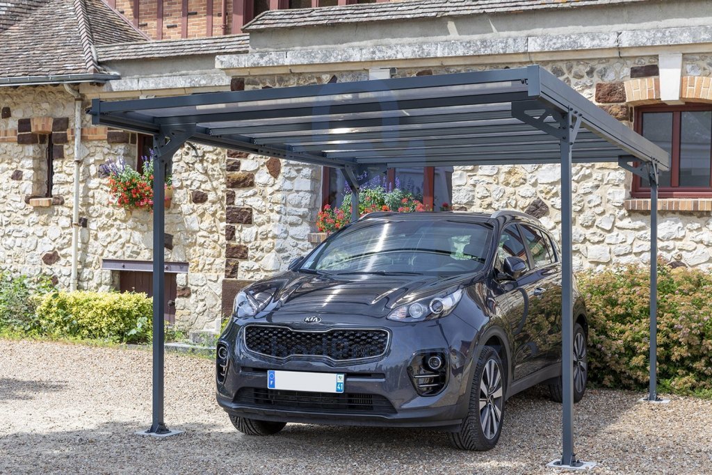 Kovový přístřešek na auto TRIGANO JARDIN MISTRAL francouzské výroby má robustní a odolnou konstrukci vyrobenou z hliníkových profilů, které jsou opatřeny vypalovanou práškovou barvou v odstínu antracit. Střecha je vyrobena z komůrkového polykarbonátu kouřově hnědé (bronz) barvy. Tento přístřešek pro auto se hodí na každou zahradu a soused Vám ho bude závidět.