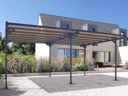 Kovový přístřešek na auto TRIGANO JARDIN MISTRAL DOUBLE má robustní a odolnou konstrukci vyrobenou z hliníkových profilů, které jsou opatřeny vypalovanou práškovou barvou v odstínu antracit. Střecha je vyrobena z komůrkového polykarbonátu kouřově hnědé (bronz) barvy.