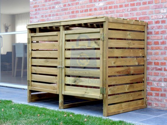 Dřevěný úložný box na 2 popelnice. Dřevo je ošetřeno tlakovou impregnací proti plísní, přesto ho doporučujeme ošetřit vhodnou povrchovou úpravou pro venkovní dřevo (podle vlastní volby) - tzn. protiplísňový nátěr plus např. lazura.