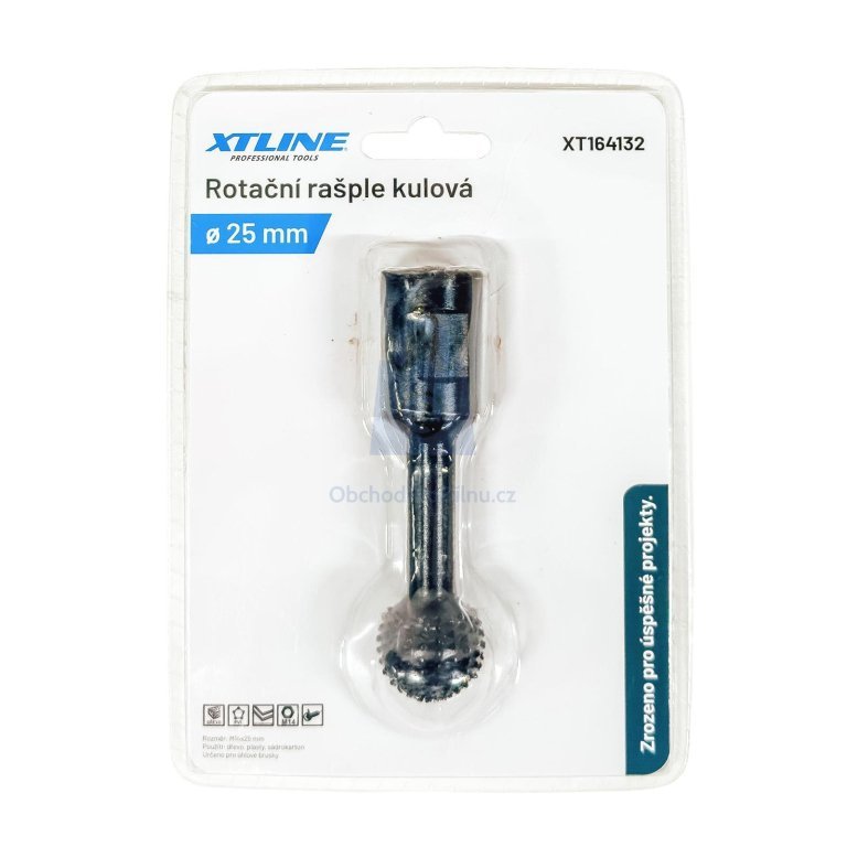Kulová rotační rašple XTLINE je určena pro hrubé opracování, tvarování a odebírání měkkých materiálů, jako je dřevo, plast nebo sádrokarton. Kulový tvar umožňuje přesné vedení v zaoblených a hůře přístupných místech. Rašple je vybavena závitem M14 pro použití s úhlovými bruskami. Dostupná je v několika rozměrech s průměry kulové části od 20 do 40 mm. Maximální provozní otáčky jsou 12 500 ot./min pro všechny varianty.