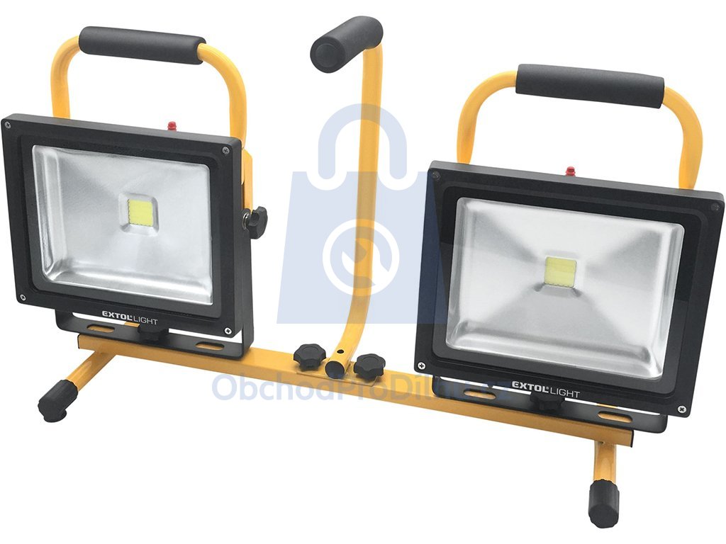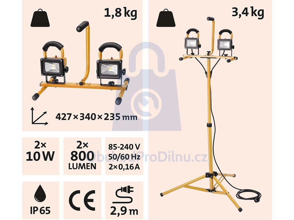 LED světlo se dvěma reflektory a teleskopickým stojanem je zdrojem světla vhodného pro práci či pro dočasné osvětlení vnitřních i vnějších prostor. Reflektory mají přívodní kabel o délce 290 cm. LED svítidlo je určeno pro instalaci na přenosný stojan s rukojetí pro přenášení, který je možno nainstalovat na teleskopickou trojnožku s nastavitelnou výškou a možností natočení kolem osy v rozsahu 360°. Světlo se vyznačuje nízkou spotřebou energie a je vhodné i pro použití v místech s omezeným zdrojem elektrické energie (elektrocentrály, solární panely...). LED reflektor se dále vyznačuje odolností proti dešti, prachotěsností, bezúdržbovostí, mechanické odolností a dlouhou životností. V naší nabídce naleznete dvě varianty.