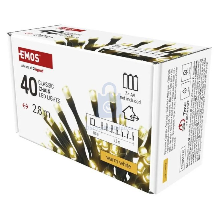 Výrobce: EMOS. Bateriový LED řetěz CLASSIC s časovačem a teplým bílým světlem pro vnitřní i venkovní výzdobu.