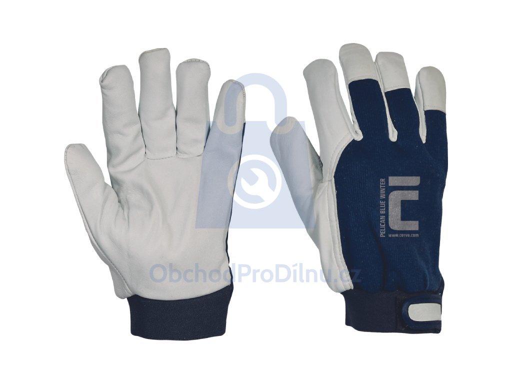 Zateplené zimní pracovní rukavice PELICAN jsou šité z ovčí lícové kůže v dlani a modré bavlněné tkaniny na hřbetu. Rukavice jsou vybaveny manžetou na suchý zip. Rukavice vyhovují normám EN 420.
