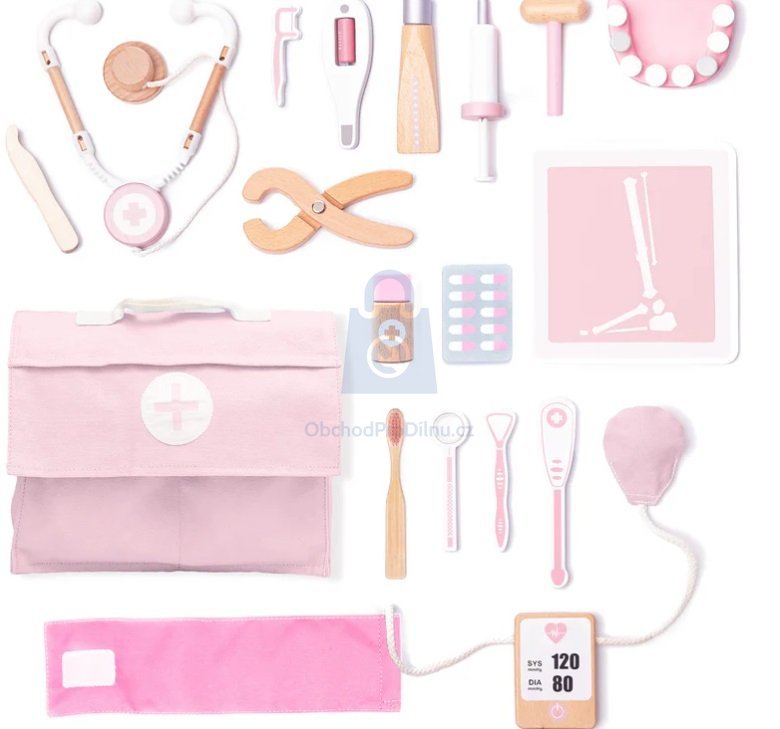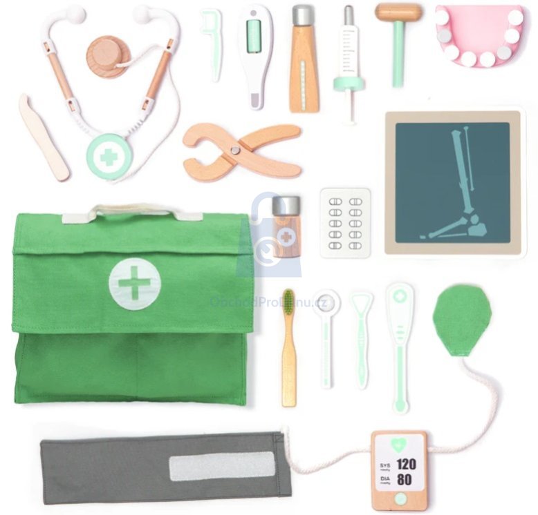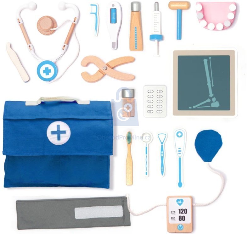 Dětská dřevěná lékařská/zubařská sada je ideální hračkou pro vše děti, pokud si rády hrají na doktory. S 18 dílnou sadou mohou léčit plyšáky a ošetřovat jim zranění. V sadě dítě najde všechno potřebné vybavení pro to, aby se cítilo jako opravdový doktor nebo zubař: teploměr, tlakoměr, injekční stříkačku, stetoskop, neurologické kladívko, rentgen dolní končetiny, pinzetu, mast, náplasti i léky. Ze zubařského vybavení dále model čelisti se zuby, mezizubní mečík s nití, škrabku na jazyk, dentální lupu, kartáček a kleště na extrakci zubů. Vše je navíc uloženo v doktorské brašně.