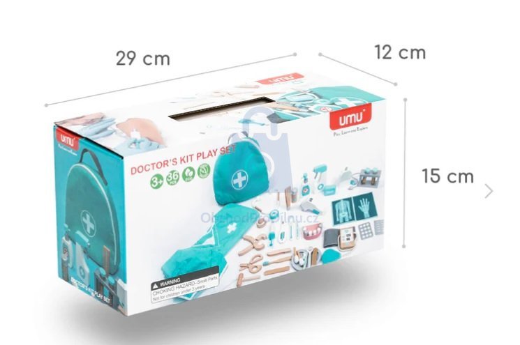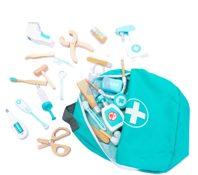 Dětská dřevěná lékařská/zubařská sada DELUXE je ideální hračkou pro všechny děti, zejména pak pro ty, které si rády hrají na doktory. S 32 dílnou sadou mohou léčit plyšáky a ošetřovat jim zranění. V sadě dítě najde všechno potřebné vybavení pro to, aby se cítilo jako opravdový doktor nebo zubař: teploměr, tlakoměr, injekční stříkačku, stetoskop, neurologické kladívko, rentgen horní i dolní končetiny, pinzetu, mast, náplasti, léky, dezinfekci, doktorskou čepici a plášť, mýdlo, emitní misku a nůžky. Ze zubařského vybavení dále model čelisti se zuby, mezizubní mečík s nití, škrabku na jazyk, dentální lupu, kartáček a kleště na extrakci zubů. Vše je navíc uloženo v doktorské brašně.