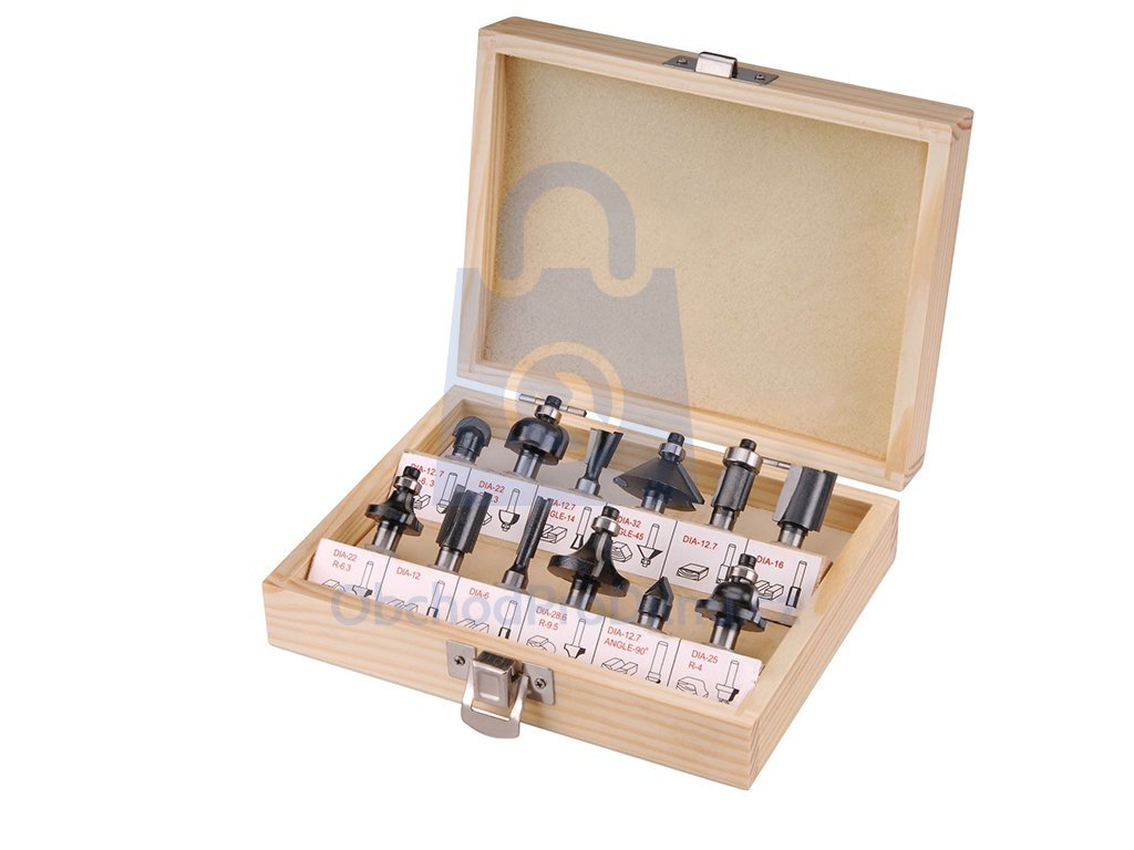 Sada různých tvarových a úhlových fréz s SK plátky se stopkou průměr 8 mm. Sada obsahuje 12 ks fréz. Široká škála druhů fréz umožňuje jejich různorodé použití. Dodáváno přehledně uložené v dřevěné kazetě.