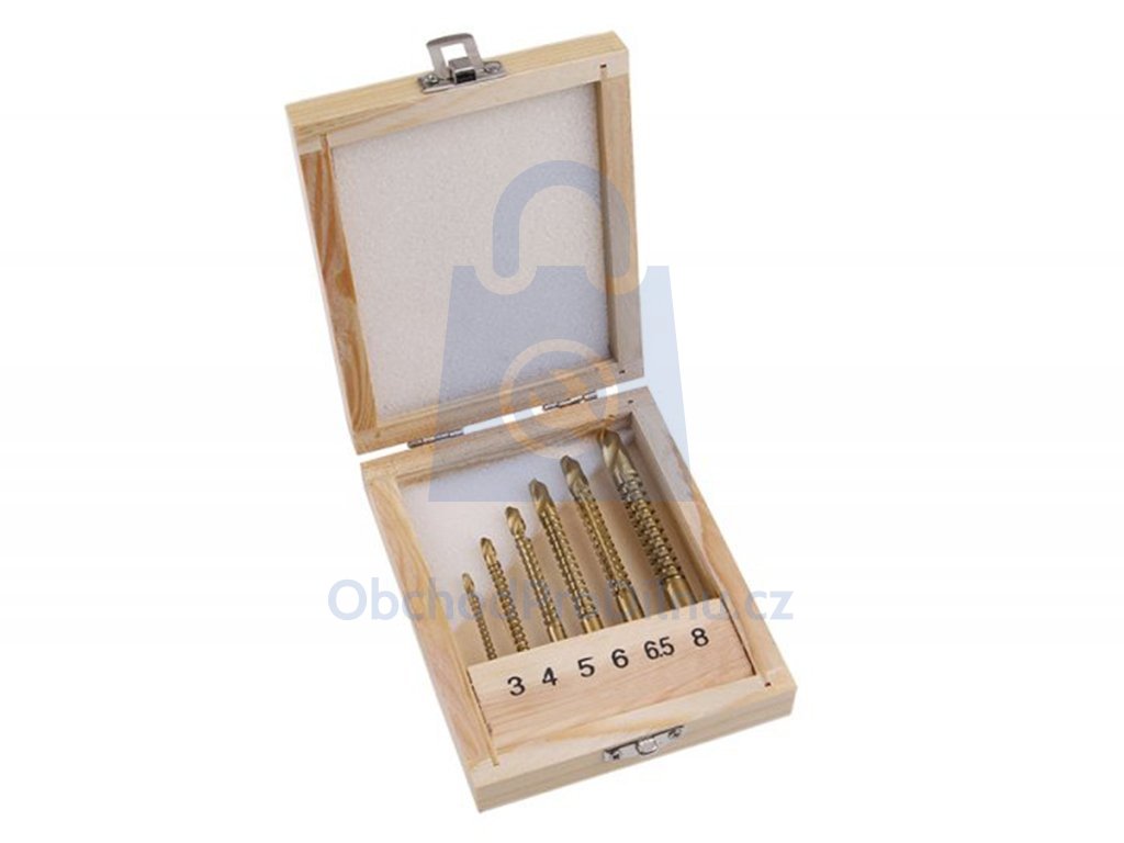 Sada frézovacích vrtáků HSS s TiN vrstvou, speciální šroubovice pro vrtání a frézování. Rozměry: 3, 4, 5, 6, 6.5, 8 mm. Použití pro vrtání, rozfrézování i vyřezání otvorů do potřebného tvaru ve dřevěných, plastových a sádrokartonových materiálech.