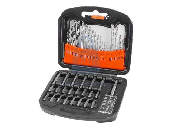 Sada nářadí obsahuje 44 bitů a vrtáků do dřeva, oceli i zdiva v nejčastěji používaných velikostech. Součástí sady je také šablona na zjišťování průměrů od 1 do 10 mm. Sada vrtáků a bitů je balena v uzavíratelném kufříku.