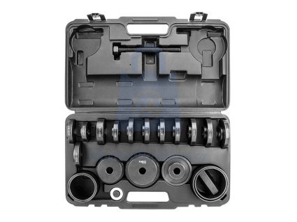 Sada na lisování ložisek kol, 22 dílů, NEO tools pro montáž ložisek, těsnění a pryžových spojek je určena pro strojní a servisní práci. Sada obsahuje 51 částí, každá tato část má v kufříku své definované místo.