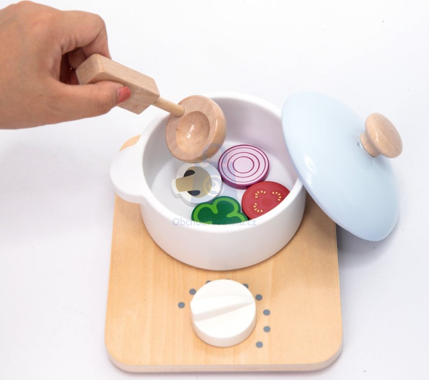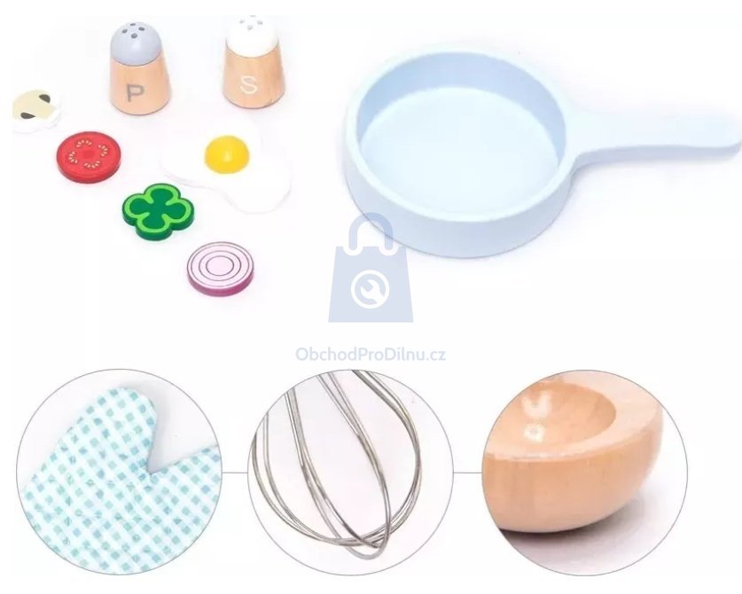 S 18dílnou sadou na vaření si může vaše dítě prožít, jaké to je být kuchařem nebo dokonce šéfkuchařem. Pro přípravu dobrot bude mít k dispozici sporáček, pánvičku, hrnec s pokličkou, kuchyňskou chňapku, kuchařskou zástěru a čepici, pepřenku, slánku, vařečku, naběračku, metličku a obracečku. V sadě se nachází také nějaké potraviny - paprika, rajče, cibule, žampion a volské oko.