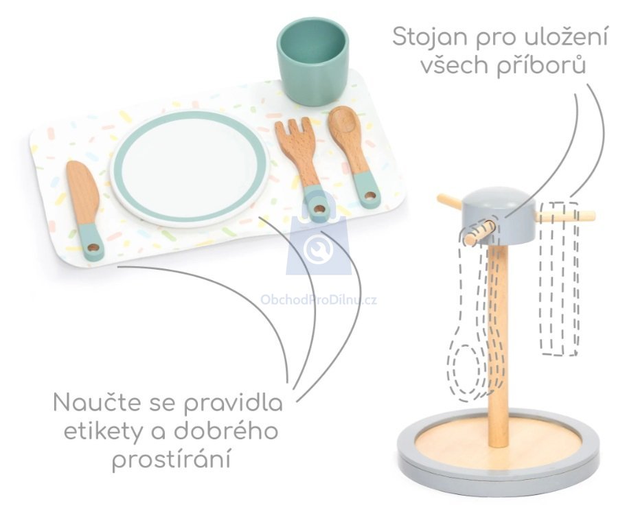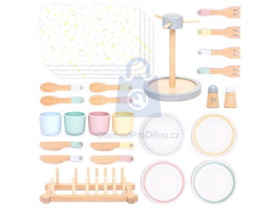 Velká sada nádobí obsahuje celkem 28 dílů. Naleznete v ní vše, co je potřeba pro stolování: talířky, hrnečky, příbory, stojan na příbory, odkapávač na nádobí i prostírání. Díky této sadě pomůžete dětem osvojit si správné zásady stolování a užít si spoustu legrace.