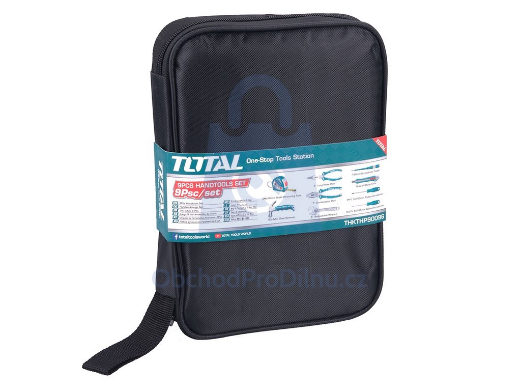 Sada nářadí TOTAL obsahuje celkem 9 dílů. Naleznete v ní 2 šroubováky, nastavitelný klíč, kombinované a půlkulaté přímé kleště, zkoušečku napětí, malé pokrývačské kladivo, lámací nůž a svinovací metr. Sada nářadí je dodávaná v textilním pouzdře a je vhodná především pro hobby použití.