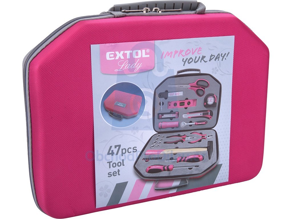 Praktická sada ručního nářadí EXTOL LADY je určena všem šikovným ženám. Opravit, utáhnout, povolit, vyvážit, pověsit obraz na zeď, smontovat novou skříňku - to vše zládnete hravě! Sada obsahuje 47 ks nářadí laděného do růžové barvy. Nářadí je přehledně uloženo v pevném textilním pouzdře na zip s uchem na přenášení. Podívejte se i na další nářadí pro ženy EXTOL LADY.