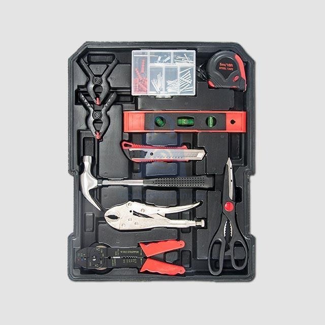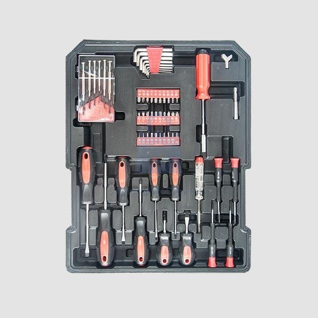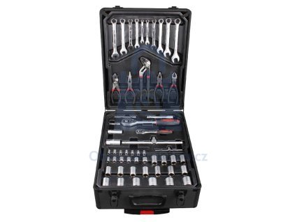 charakteristika produktu obsahuje kleště různého typu, ráčny 1/4" a 1/2", hlavice nástrčné 1/4" a 1/2", očkoploché klíče, imbusové klíče, šroubováky včetně hodinářských, bity s držákem, klíče na svíčky, prodloužení, vratidla, měřicí pomůcky, kladivo, nůžky, svěrky, elektrikářskou pásku, zkoušečku napětí a drobný spojovací materiál