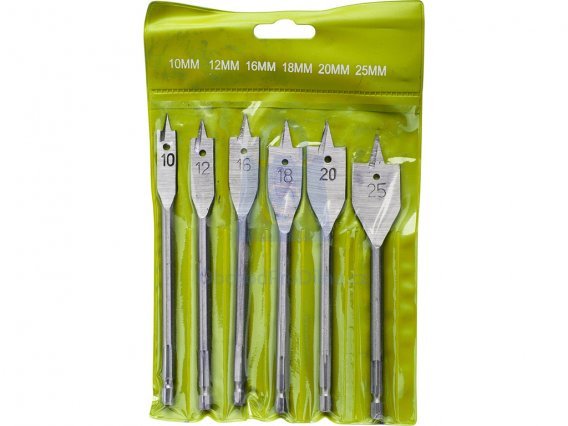 Sada vrtáků obsahuje 6 plochých ocelových vrtáků se šestihrannou stopkou a průměrem od 10 do 25 mm určených pro rychlé vrtání do měkkého i tvrdého dřeva. Vrtáky mají ostrou vodicí špičku s přesně boušenými břity. Vrtáky mají šestihrannou stopku pro rychlé upnutí ve sklíčidle.