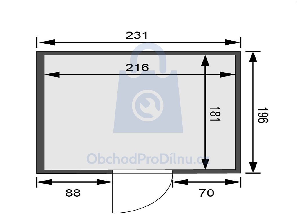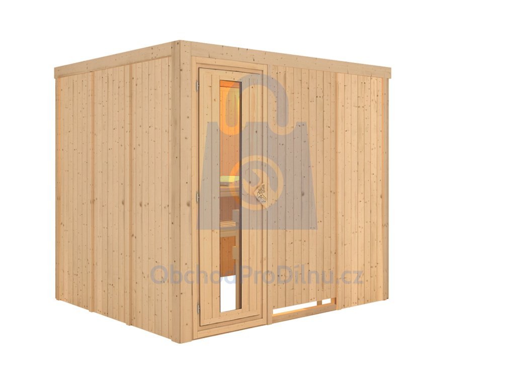 Malá finská sauna pro dvě osoby s rozměry 231 x 196 cm. Tento model finské sauny je určený do temperovaných interiérů domu nebo bytu. Její výrobce, firma KARIBU HOLZTECHNIK z německých Brém, dokázala svými výrobky úspěšně navázat na staletou tradici skandinávského saunování a současně do ní zapracovat dnešní moderní technologie. Sauna je celá vyrobena ze dřeva severského smrku v přírodním provedení. Dřevo pochází ze vzdáleného severu Evropy a je chemicky naprosto neošetřené (není ani namořeno ani nalakováno). V důsledku toho je prosté všech známých problematických látek, které by se v průběhu saunování mohly ze dřeva uvolňovat. Tato interiérová sauna vykazuje mimořádné tepelně-izolační vlastnosti. Stěny sauny jsou složeny z vnitřní a vnější vrstvy speciálně hlazených prken s perem a drážkou, mezi kterými je 42 mm silná tepelná izolace v podobě minerální vlny. Celková síla stěny je tak 68 mm. Zadní nebo boční nepohledové strany orientované ke stěně místnosti mají vnější stranu ze sololitu. Proto jsou při stejné tepelné izolaci o cca 10 mm tenčí než pohledové strany pokryté palubkami.