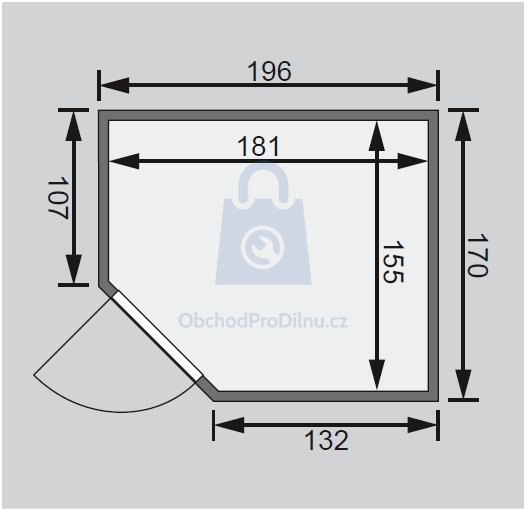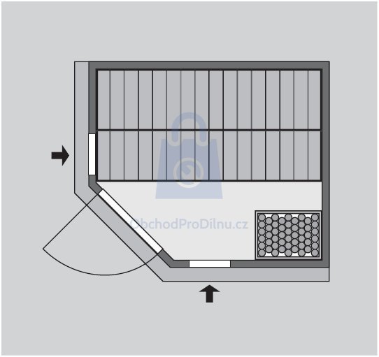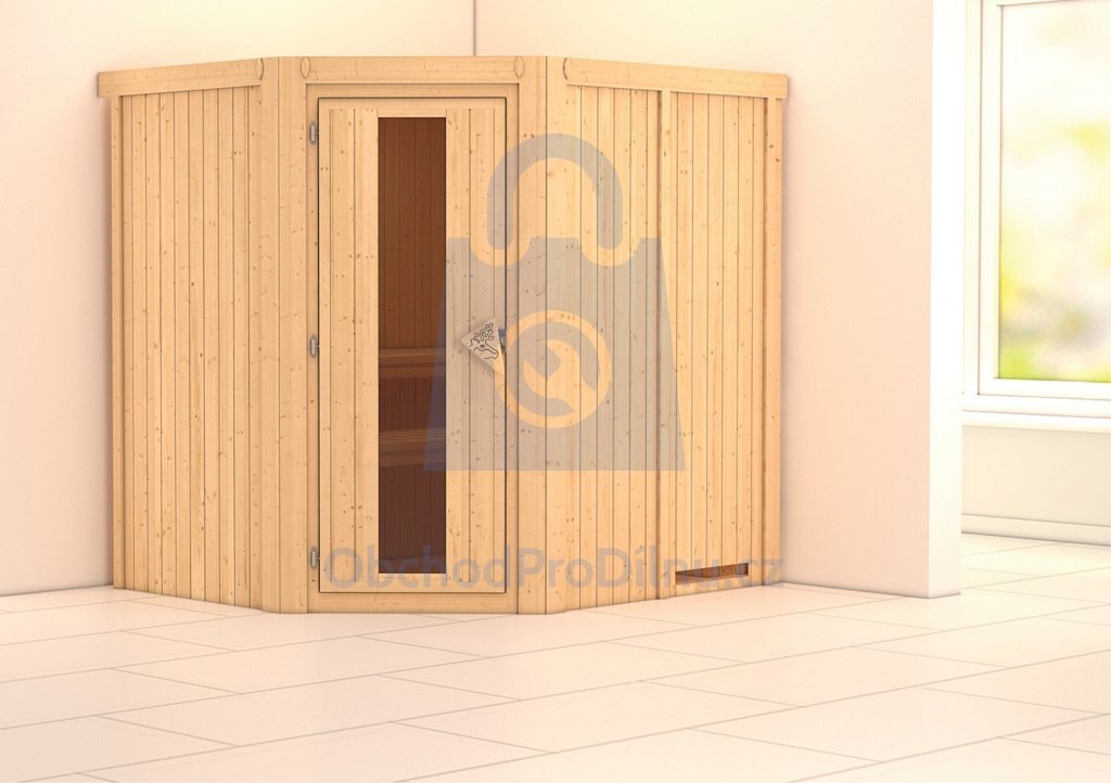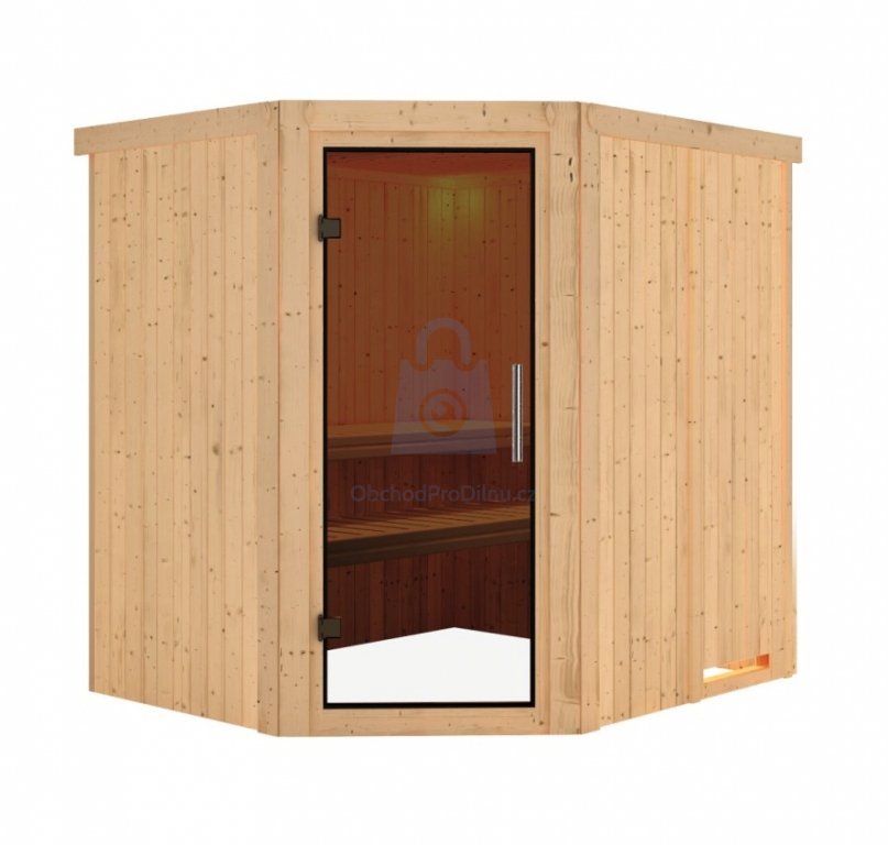 Sauna nemá vlastní podlahu a je nutné ji umístit výhradně v místnosti s odpovídající podlahovou krytinou, ideálně dlažbou. Sauna je dodávána bez dřevěného profilu u stropu, ve kterém může být instalováno dodatečné LED osvětlení.