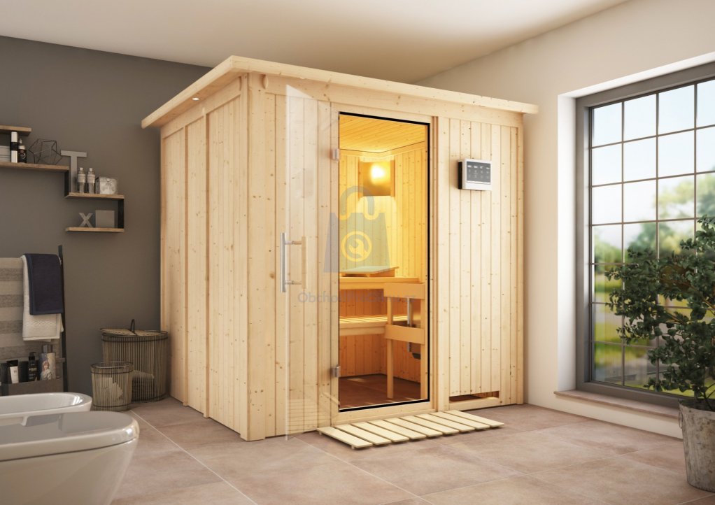 Sauna nemá vlastní podlahu a je nutné ji umístit výhradně v místnosti s odpovídající podlahovou krytinou, ideálně dlažbou. Sauna je dodávána bez dřevěného profilu u stropu, ve kterém může být instalováno dodatečné LED osvětlení.