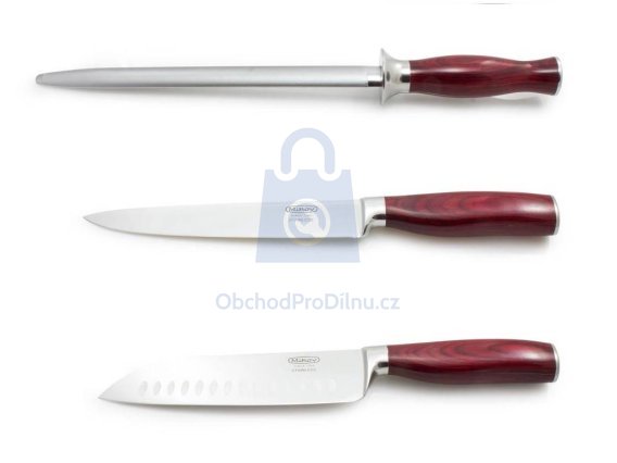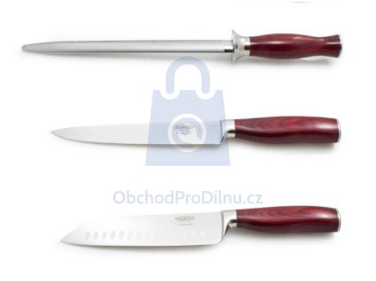Nože jsou vyrobeny z martenzitické korozivzdorné oceli DIN 1.4116 (55 HRc) s vynikající řezivostí a odolností vůči korozi. Dřevěná ergonomická držadla jsou precizně zpracována a opatřena kováním chránícím prsty. Součástí sady je oválná ocílka RUBY pro rychlé a přesné nabroušení ostří.