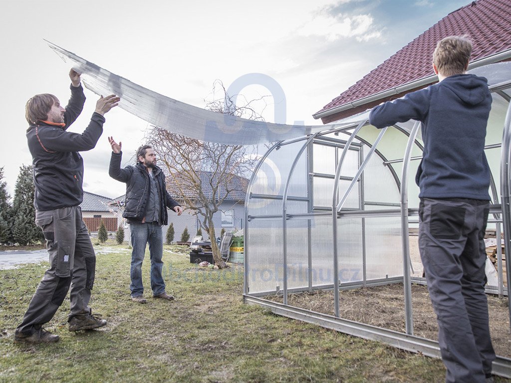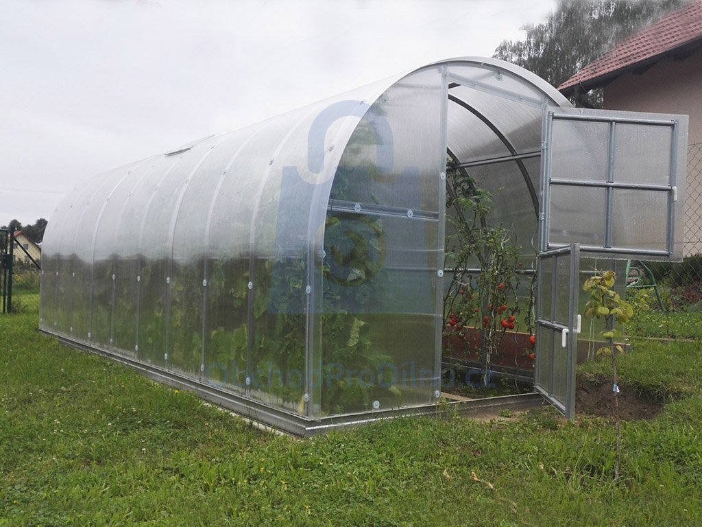 provedení, specifické vlastnosti obloukový skleník s pozinkovanou ocelovou konstrukcí (1,0 mm)