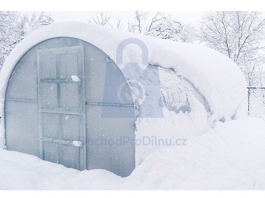 Díky obloukovému tvaru a vnitřním vzpěrám skleník skvěle odolává větru i sněhové zátěži. Unikátní systém kotvení pomocí "T" kotev umožňuje snadnou instalaci přímo do země bez nutnosti budovat betonové základy.