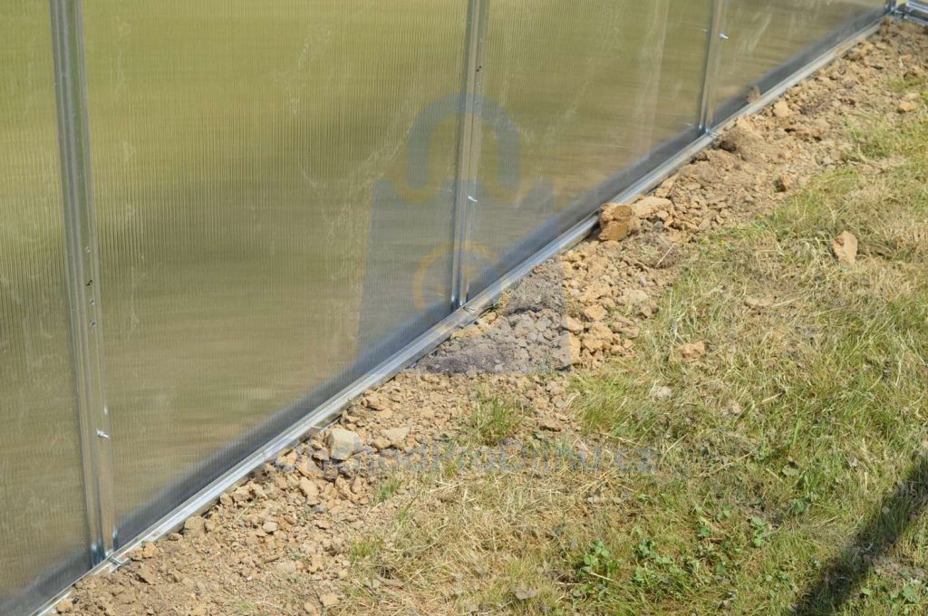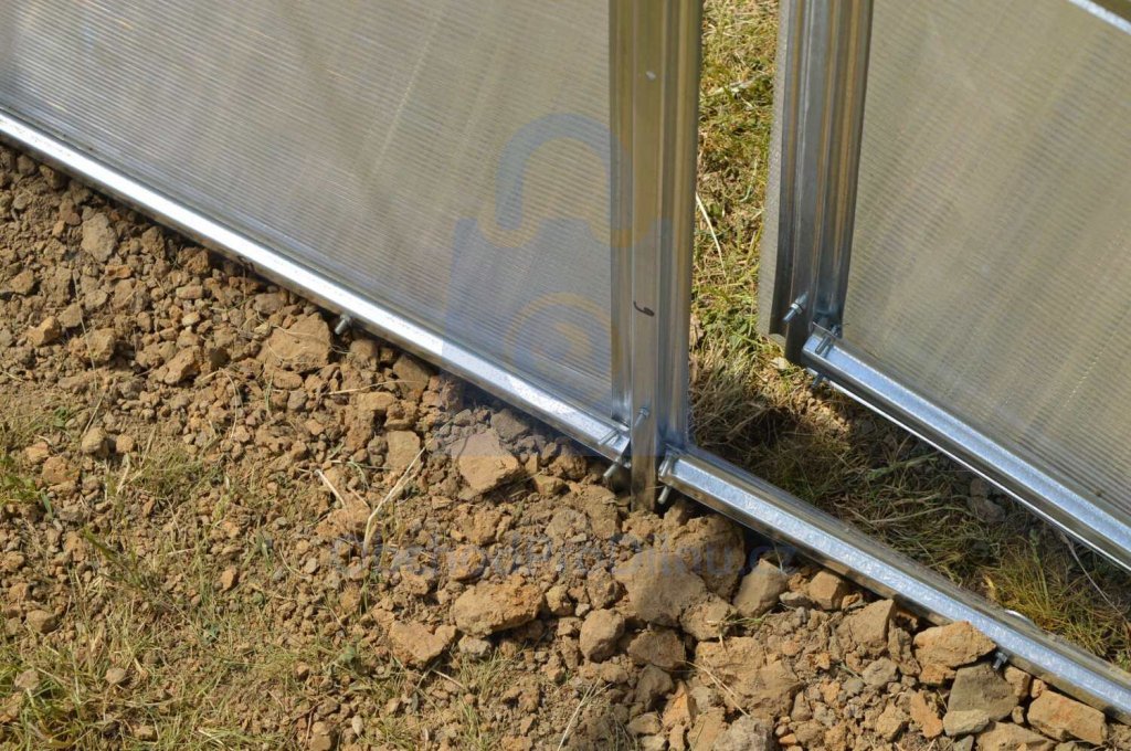 Konstrukce skleníku je připravena na zapuštění do země, tudíž není nutná podezdívka. Do země se zasype konec oblouků do hloubky cca 20-25 cm, ke kterým je přišroubován profil ve tvaru obráceného velkého T, který chrání skleník před vytržením ze země. Pokud máte hotovou zděnou či betonovou podezdívku, je možné zde také skleník ukotvit. Vyžaduje to však drobné kutilské zásahy a především domácí výrobu atypických plechových L úchytek pro přišroubování skleníku k podezdívce (výrobce s kotvením na podezdívku nepočítá).