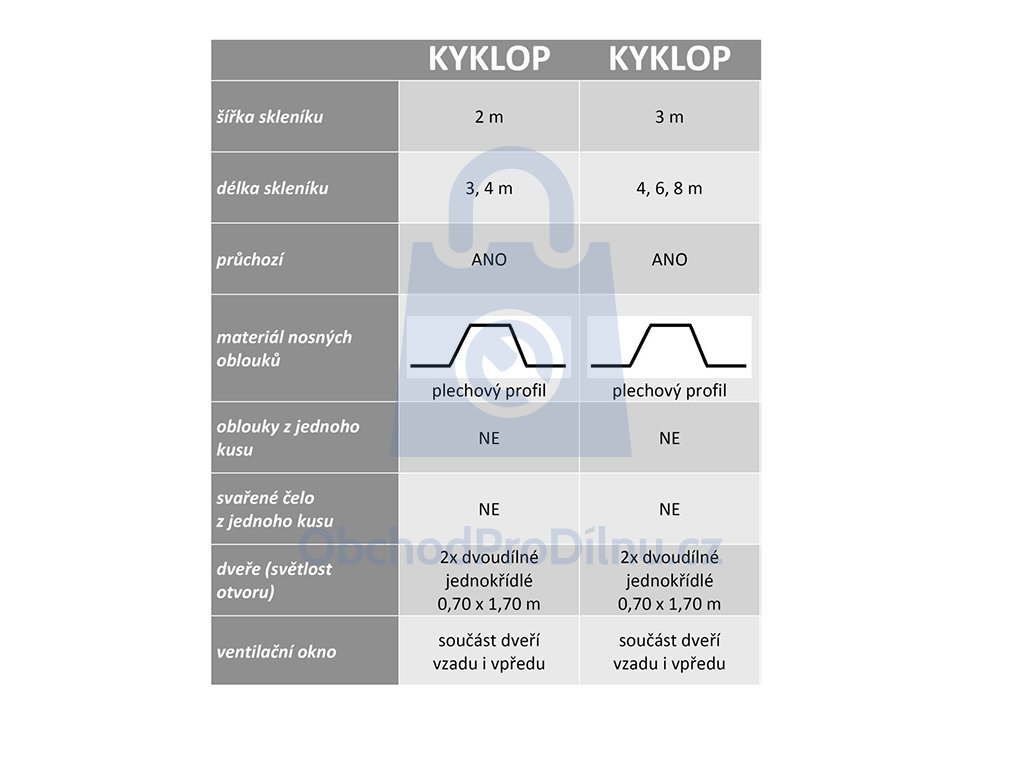 Polykarbonátový skleník LanitPlast KYKLOP vyniká svými izolačními schopnostmi a vynikající odolností proti zátěži. Tento obloukový skleník má stěny z dutinkového polykarbonátu o tloušťce 4 mm nebo 6 mm. Prosklení je vyrobeno z kvalitního polykarbonátu MARLON (výrobce Brett Martin Velká Británie), který v ČR prošel náročnými testy ve státem akreditovaných zkušebnách jako stavební materiál. Konstrukce skleníku je vyrobena z galvanicky pozinkovaných ocelových profilů a díky malé rozteči oblouků je garantována vysoká únosnost celé konstrukce. Skleník Kyklop je průchozí z obou stran díky vestavěným dvojitým dveřím. Skleník nepotřebuje žádnou podezdívku, protože konstrukce skleníku je připravena na zapuštění do země do hloubky cca 35 cm. Skleník je dodáván jako stavebnice s podrobným montážním návodem.