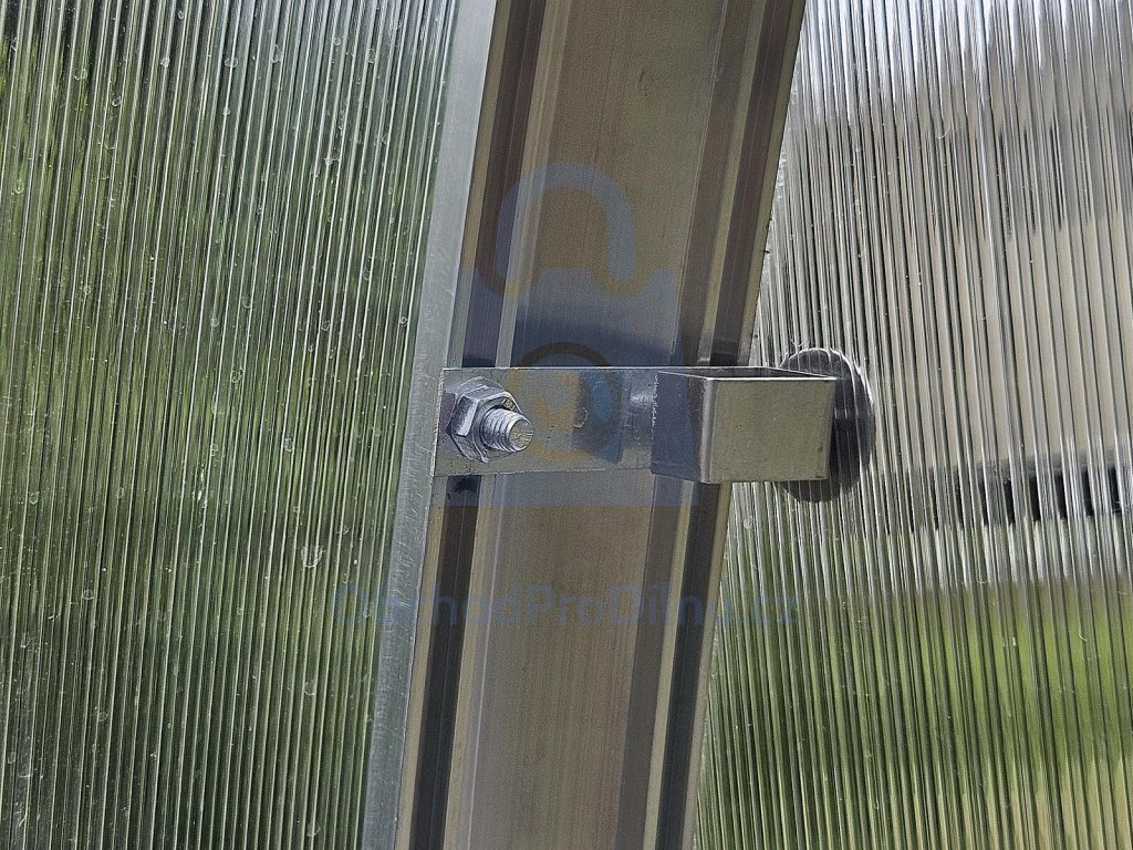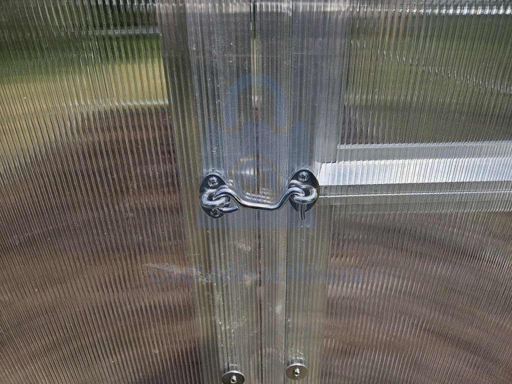Zasklení tvoří prémiový komůrkový polykarbonát MARLON (síla 4, 6 nebo 8 mm) s certifikací od Státního zdravotního ústavu. Materiál má silný UV filtr a nekompromisní záruku 10 let na nerozbitnost krupobitím. Skleník je vybaven prostornými dvojitými dveřmi a zadním větracím oknem.