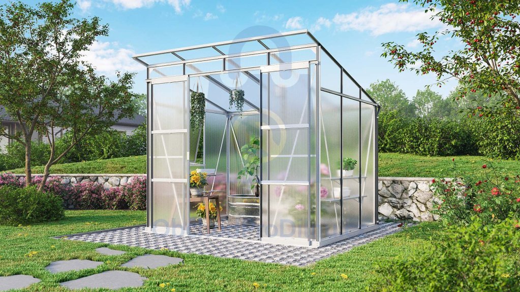 Skleník je vyroben z eloxovaných hliníkových profilů a jeho prosklení je tvořeno dvoustěnnými tepelně izolačními polykarbonátovými deskami o síle 6 mm. Inovativní technologie zasklení používá rámování desek mezi hliníkovými profily a polykarbonátovými lištami, což zajišťuje vyšší odolnost proti větru a sněhu v porovnání s tradičními pružinovými sponami. Skleník má také velmi nízký práh, který usnadňuje přístup (například při vstupu se zahradním kolečkem).