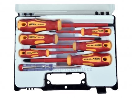 Sedmidílná sada obsahuje 6 elektrikářských šroubováků: 3 šroubováky pro plochou a 3 šroubováky pro křížovou phillips drážku. Dřík šroubováku je vyroben z kvalitní chrom-vanadové oceli. Rukojeť je ergonomicky tvarována a měkčena kvalitní protiskluzovou TPR pryží, což zvyšuje kroutící sílu šroubováku. Součástí sady je také zkoušečka napětí. Elektrikářské šroubováky vyhovují normě TÜV/GS.