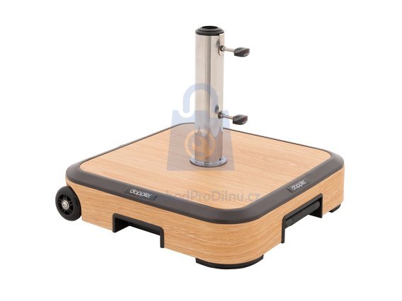 Pojízdný stojan s kolečky pro snadnou manipulaci a přemístění slunečníku na jiné místo. S pomocí 2 koleček a zasouvací rukojeti se s podstavcem snadno a bez námahy manipuluje. Výsuvná rukojeť a kolečka s hladkým chodem umožňují snadný pohyb slunečníků. Podstavec je ve velice elegantním provedení a stylové hliníkové pouzdro má motiv dřeva. Hrany podstavce jsou zaoblené, tudíž zabraňují nebezpečí poranění. Rukojeť lze snadno uložit do základny. Slunečník do stojanu bezpečně ukotvíte pomocí robustní nerezové trubky a dvou zajišťovacích šroubů. V balení naleznete také redukční kroužky včetně vložek, které jsou určené pro slunečníky s průměrem stojné tyče od 32 do 60 mm (vždy zohledněte velikost slunečníku a doporučené minimální zatížení).