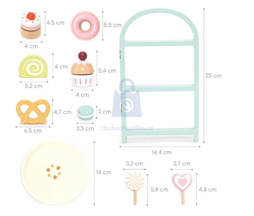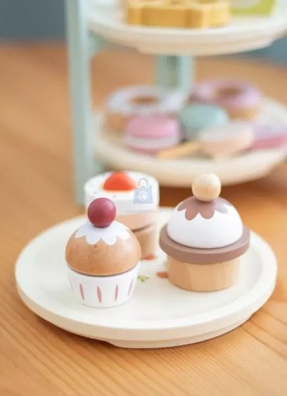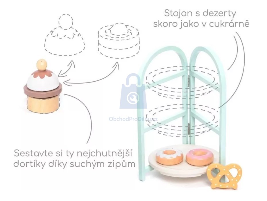 Dopřejte svým dětem, aby si doma otevřey vlastní cukrárnu! S dřevěným servírovacím stojan se zákusky si budou připadat jako v opravdové prodejně cukrovinek. V 16dílné sadě naleznete stojan, servírovací talíře, několik druhů dortíků, makronek a dalších zákusků a také preclík pro ty, kteří preferují slané chutě.