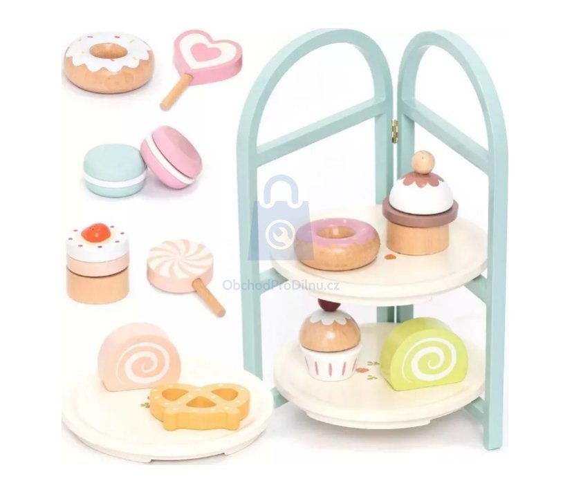 Dopřejte svým dětem, aby si doma otevřey vlastní cukrárnu! S dřevěným servírovacím stojan se zákusky si budou připadat jako v opravdové prodejně cukrovinek. V 16dílné sadě naleznete stojan, servírovací talíře, několik druhů dortíků, makronek a dalších zákusků a také preclík pro ty, kteří preferují slané chutě.