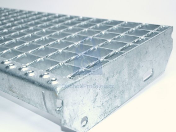 Ocelové schodišťové stupně, žárově pozinkované, provedení SP (odporově svařováno, na nosný pásek 30x2 mm jsou přivařeny rozpěrné pruty z krouceného drátu). Na přední straně kovové schodnice je navařena děrovaná nášlapná hrana, která výrazně snižuje riziko uklouznutí.