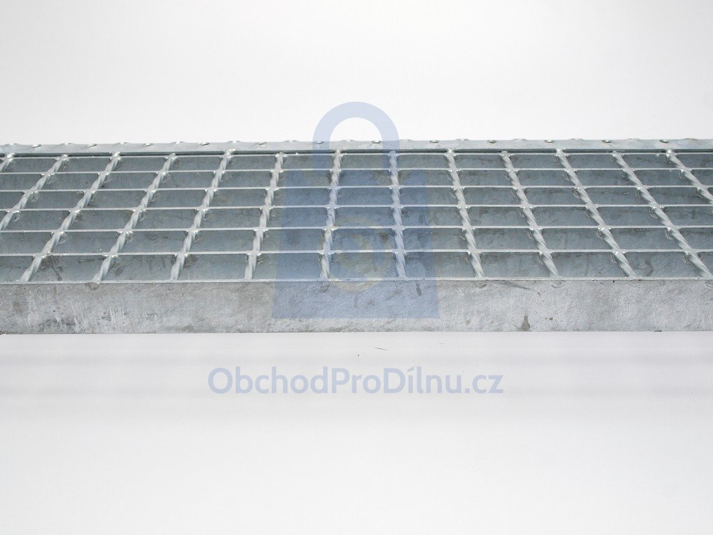 Ocelové schodišťové stupně, žárově pozinkované, provedení SP (odporově svařováno, na nosný pásek 30x3 mm jsou přivařeny rozpěrné pruty z krouceného drátu).