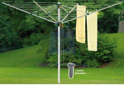 Jednoduchý zemní šroub = ukotvení do země je vyřešeno pomocí plastového zemního šroubu. Ten se zašroubuje (zavrtá) do země a do něj se zasune nosná tyč sušáku. Není nutné nic betonovat. Výhodou zemního šroubu je možnost postavit sušák na zahradě kdekoliv, kde je možné zemní šroub pevně zavrtat do země. Šroub je opatřen plastovým víčkem. Šroub se musí zavrtat do roviny s povrchem, pak je bezpečný i pro travní sekačku.