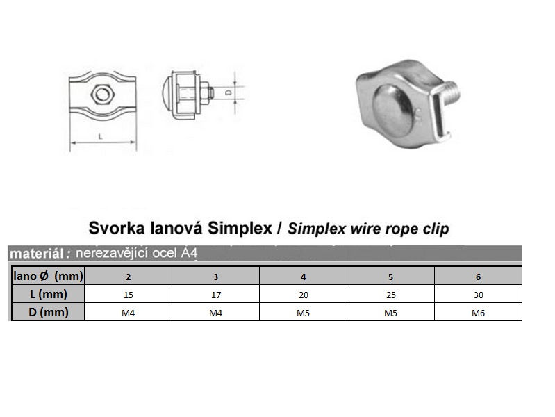 Dobrý den, děkujeme za Váš dotaz ohledně lanových svorek simplex a jejich použití pro různé průměry lanek. Tato informace bohužel v naší tabulce opravdu chybí. V nejbližší době bude doplněna do rozměrové tabulky. Nicméně pro lanko o průměru 4 mm je vhodná svorka s katalogovým číslem 2335003. Přeji příjemný den.