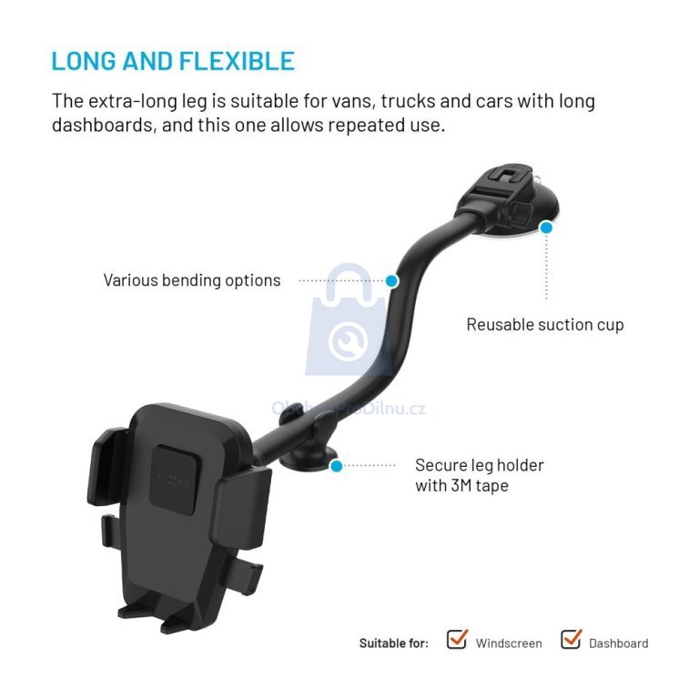 FIXED Iconiq Flex XL: Na čelní sklo nebo palubní desku s flexibilním ramenem (29 cm, možnost ohýbání a zajištění 3M páskou).