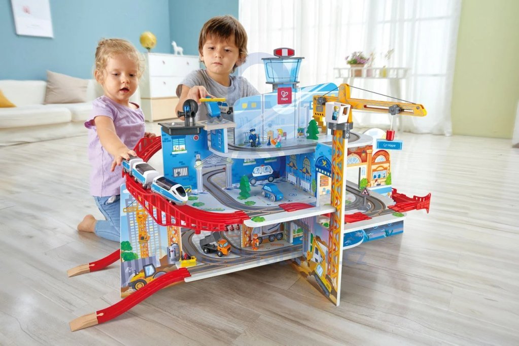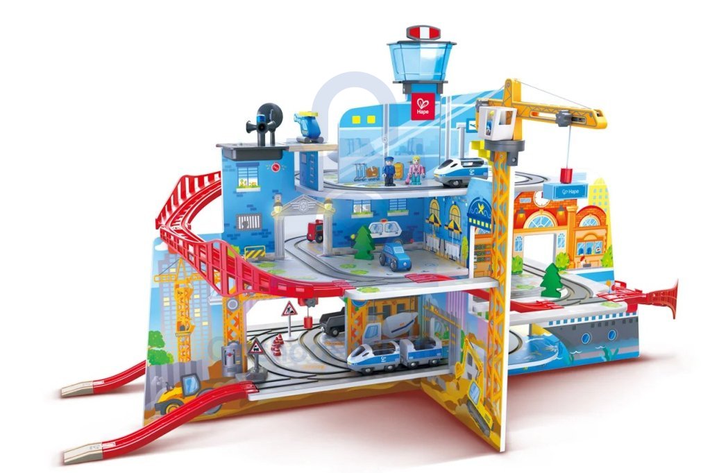 Výrobce: Hape. Luxusní třípatrová vláčkodráha s horským vlakem a městem – ideální pro rozvoj fantazie a motoriky dětí od 3 let.