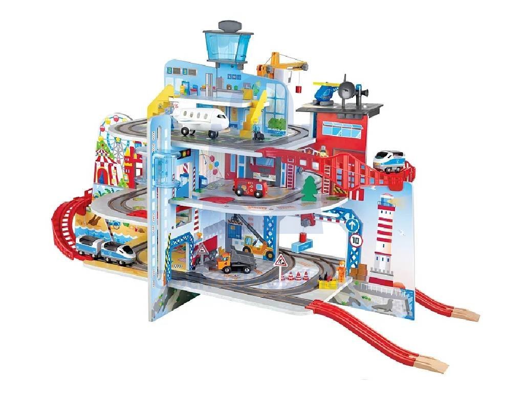 Vláčkodráha Grand City od značky Hape je třípatrová herní sada s množstvím doplňků, která přináší dětem nekonečné možnosti zábavy a kreativity. Součástí je horský vlak na setrvačník a kompletně vybavené město s letištěm, přístavem, zábavním parkem, policejní stanicí, staveništěm, hasičskou stanicí a pláží. Hračka rozvíjí jemnou motoriku, představivost a podněcuje k vyprávění vlastních příběhů. Součástí balení je třípatrová základna s bohatým příslušenstvím – letadlo, výtah, nákladní automobil, tři vagony, policejní stanice, plastové koleje, otočný disk pro přepravu zavazadel, čtyři figurky, zdvihací brána, jeřáb, pilíře, brány, dopravní značka a mnoho dalších detailů. Sada je napájena dvěma bateriemi typu LR44, které jsou součástí balení.